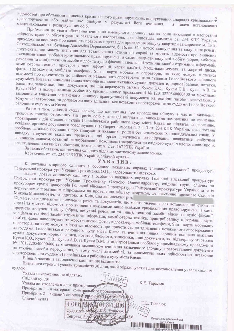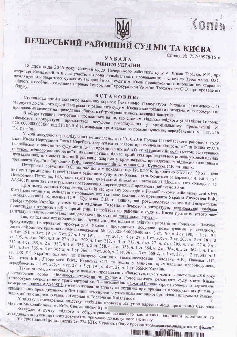 Как уже потом оказалось, что основанием для обыска стало совсем не то, что указано в Постановлении суда (давление на судью при рассмотрении им дел Януковича, Курченко, Клименко). Просто именно этот член Автомайдана был свидетелем того, как в суд подъехала Елена Первушина на незадекларированном авто. То есть его задокументировали. Получается, что если вы будете находиться у Голосеевского суда, будьте готовы, что вас документируют и собирают информацию о вашей личности.