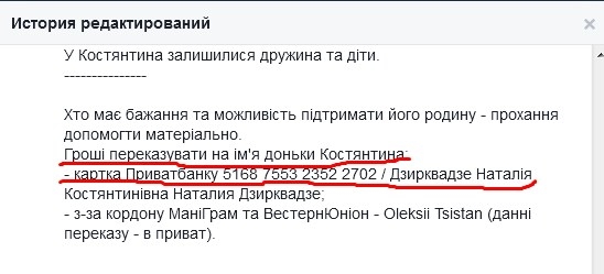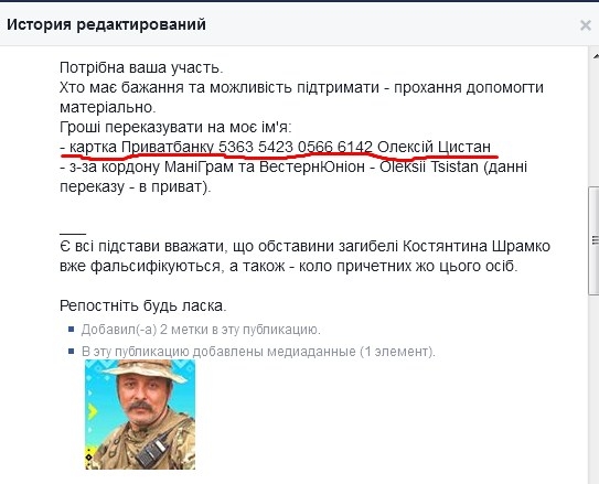Вторым "звоночком" в отношении Цистана послужил рассказ волонтеров о том, что Алексей, опубликовав информацию о гибели бойца Константина Шрамко, указал свою банковскую карту для помощи семье. На вопросы, почему не реквизиты членов семьи, он же хорошо их знает, не отвечал, а "интересующихся" просто банил в Facebook. Правда, спустя два с половиной часа отредактировал пост и указал "приватовскую" карточку дочери погибшего.
