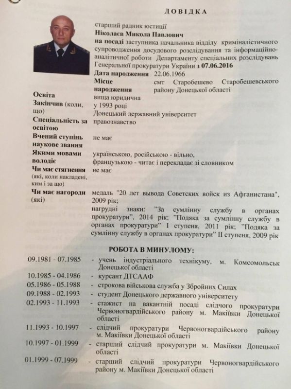 Справка по Николаеву, чья карьерный скачок в Генеральную прокуратуру чудесным образом совпал с приходом его земляка Виктора Пшонки на должность заместителя Генерального прокурора, курирующего, в том числе, следствие прокуратуры.