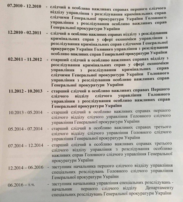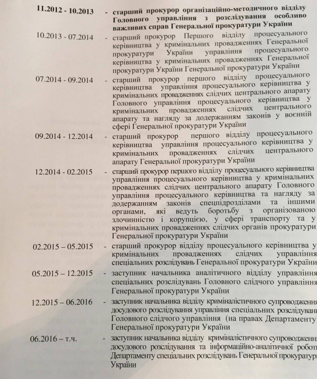 Далее. Служебная справка о карьере Горбатюка в органах прокуратуры, подтверждающая, что при Ренате Кузьмине карьера "вечного следователя" приобрела некую динамику, однако после увольнения Кузьмина из ГПУ в октябре 2013-го Горбатюк вернулся в свое амплуа, в котором спокойно пребывал как во время революции, так и после нее, вплоть до стремительного взлета в декабре 2014 года, когда экс-генпрокурор Ярема назначил его начальником управления спецрасследований ГПУ.