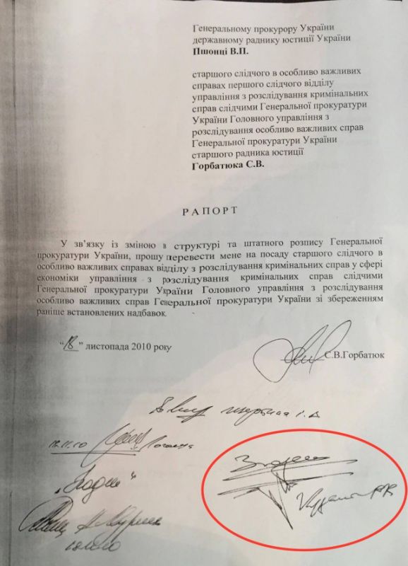 Это завизированный Кузьминым рапорт Горбатюка от 18.11.10 о переводе на должность старшего следователя по особо важным делам отдела по расследованию уголовных дел в сфере экономики ГСУ ГПУ. Все, кто работал под началом Кузьмина, могут подтвердить, что в его команде случайных людей не было, а следователей он подбирал исключительно по принципу личной лояльности.