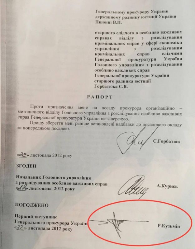 Это - также завизированный Кузьминым рапорт от 22.11.12 о переводе Горбатюка на должность прокурора организационно-методического отдела ГУ по расследованию особо важных дел ГПУ. Запомните эту дату.