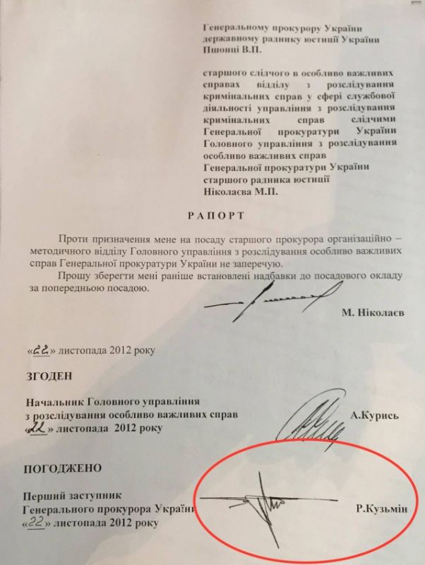Это заместитель Горбатюка, уроженец Донецкой области Николай Николаев. Рапорт о переводе на должность старшего прокурора организационно-методического отдела ГУ по расследованию особо важных дел ГПУ завизирован Кузьминым и датирован тем же числом, что и рапорт Горбатюка.