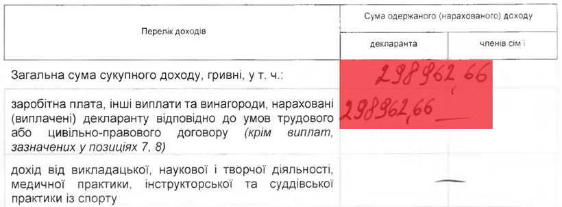У своїй декларації за 2015р. він вказав 394тис.грн. сукупного доходу, з яких 289тис.грн. - його заробітна плата, а 87тис.грн. - дохід від відчуження рухомого й нерухомого майна та інші види доходів.