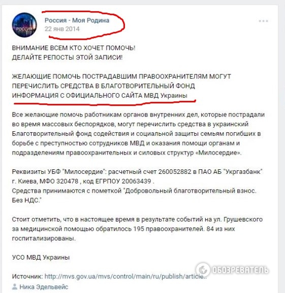 Как обнаружили читатели "Обозревателя", объявление с этими же реквизитами в 20-х числах января 2014 г. (во время столкновений на ул Грушевского в Киеве) были размещены и на сайте МВД Украины, и в многочисленных группах в соцсетях - в защиту "Беркута", "Россия - Моя Родина" и т.д.(см. скриншоты).