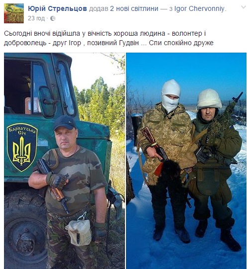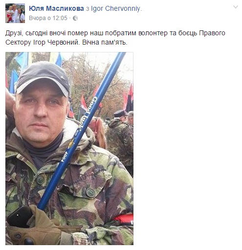 В ніч на 10 грудня помер волонтер і боєць "Правого сектора" Ігор Червонний з позивним "Гудвін" родом з міста Куп’янська Харківської області. Свої співчуття друзі і побратими бійця АТО висловлюють в Facebook.