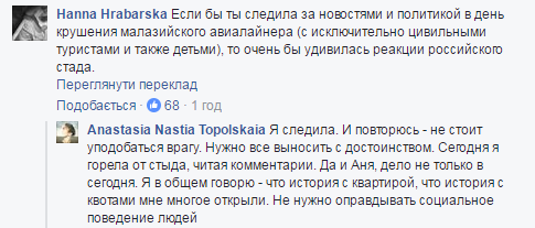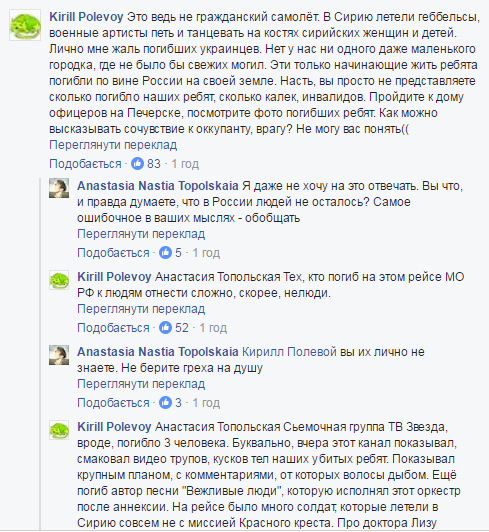 Пользователи социальной сети бурно отреагировали на пост Топольской, напомнив ей о российских военных, которые убивают людей на Донбассе и в Сирии. Кроме того, в очередной раз подчеркнули, что в Черном море потерпел крушение не гражданский самолет, а погибли те, кто "летел убивать, пропагандировать и давать концерты".