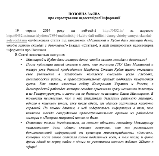 В частности, речь идет о статье под заголовком «Махницкий и Кубив дали милиции денег, чтоб замять скандал с девочками?», в которой рассказывается о методах, с помощью которых фигуранты загородных приключений пытались сгладить острые углы случившихся с ними неприятностей. Как указано в исковом заявлении: «Статья основывается на фактах, которые ничем не подтверждены и противоречат действительности, изображает мнимую роскошь проживания Олега Махницкого, содержит клевету о его аморальном поведении и направлена на формирование негативного образа его личности».