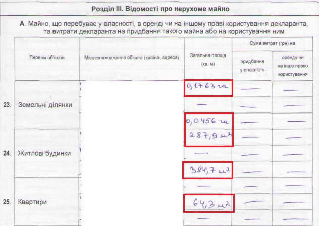 Так, згідно декларації, володіє Ігор Васильович двома земельними ділянками, будинками площею 287м² та 384м² і квартирою на 64,3м².