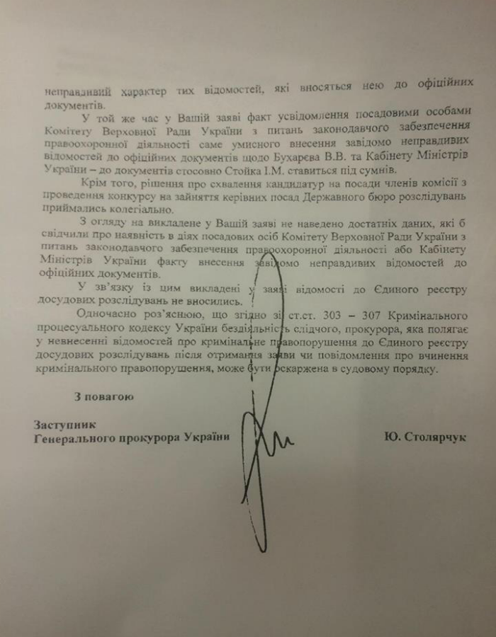 Найєм обурений тим, що підконтрольна Порошенку Генпрокуратура абсолютно не звертає уваги на правопорушення з боку комісії з обрання керівництва Держбюро розслідувань. Так, Луценко начебто не помічає, що, як мінімум, два члена комісії - Стойко І.М. (Від КМУ) та Бухарев В.В. (від ВР) – взагалі не мають вищої юридичної освіти, а це є прямим порушенням законодавства (п. 3 ч. 3 ст. 11 закону України про ДБР).