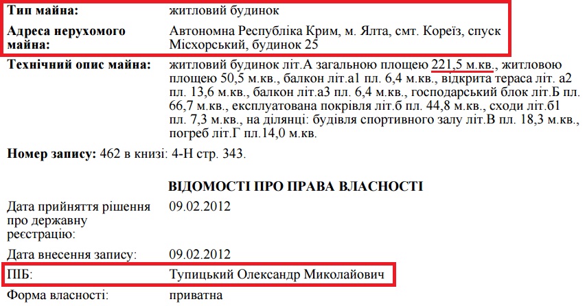 З даних декларацій (2014 та 2015 рр.) відомо, що у власності Олександра Миколайовича є житловий будинок площею 221,5м², який знаходиться в мальовничому смт. Кореїзі, на околиці Ялти. Про це свідчать і дані витягу з Державного реєстру.