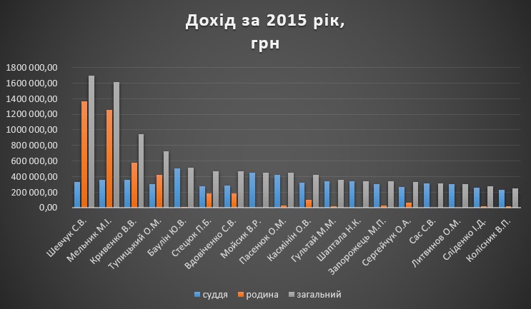 Отож, проаналізувавши дані декларацій 18 суддів КСУ за 2015 рік, маємо двох мільйонерів - Шевчук С.В. (1.697.928,16грн.) та Мельник М.І. (1.610.896,00грн). До статусу мільйонера трохи не дотягнув суддя Кривенко В.В., загальний дохід сім’ї якого склав 939.275,00грн. Статки Тупицького О.М. та Бауліна Ю.В. склали 724.791,00грн. та 514.601,00грн. відповідно. П’ятеро суддів, дохід яких близько півмільйона гривень - Стецюк П.Б. (466.831,00грн.), Вдовіченко С.В. (465.210,00грн.), Мойсик В.Р. (450.539,88грн.), Пасенюк О.М. (447.227,00грн.), Касмінін О.В. (420.645,00грн). Шестеро суддів, дохід яких в межах 400тис.грн. - Гультай М.М. (353.285,00грн.), Шаптала Н.К. (340.607,00грн.), Запорожець М.П.(335.787,24грн.), Сергейчук О.А. (328.734,04грн.), Сас С.В. (311.595,00грн.), Литвинов О.М. (303.563,00грн). І двоє суддів з доходом менше 300тис.грн. Це судді Сліденко І.Д. (272.166,00грн.) та Колісник В.П.(244.102,44грн).