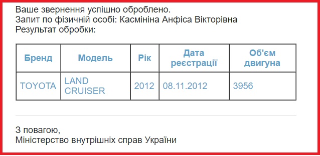 Власного автомобіля суддя не має, а от дружині належить Toyota Land Cruiser 2012р.в. Середня вартість такого автомобіля складає 60.000$.