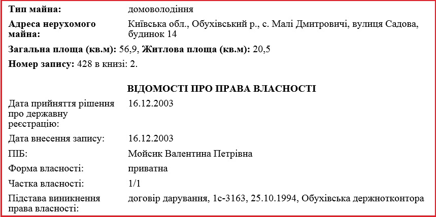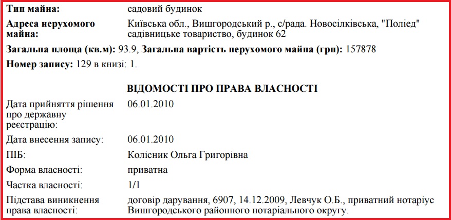 А от дружині, Ользі Григорівні, належить садовий будиночок 93,9м², що знаходиться в садовому товаристві «Поліед», Вишгородського району, який їй подарували.