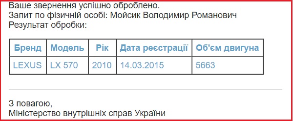 І хоч нерухомість у пана Мойсика більш ніж скромна, зате автомобіль у нього класу «люкс» - позашляховик Lexus Lx 570 2010р.в. Придбав його суддя ще у грудні 2010р., проте зареєстровано автомобіль було лише в березні 2015р., що видно з витягу Державного реєстру МВС.