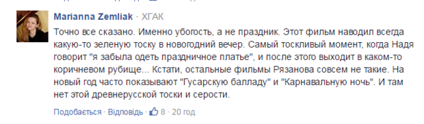 "Поэтому я, разумеется, рад тому, что уже второй год подряд Украина не видит по телевизорам этот "символ Нового года". "Иронию судьбы", разумеется, надо показывать – но не ностальгирующим старым людям, которые будут промывать мозги детям и внукам, а школьникам на уроках. А потом, для контраста, показывать американские рождественские фильмы", - предложил Гудименко.