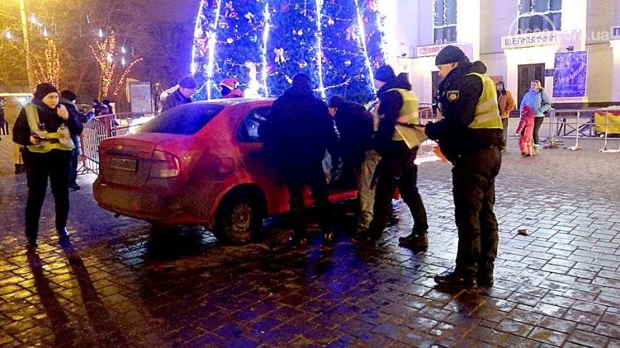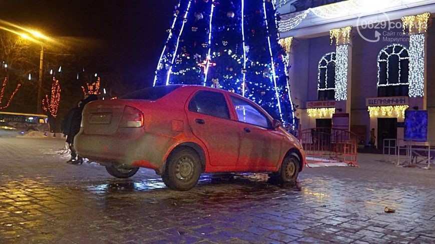 30 декабря около 19.00 пьяный полицейский на Шевроле Авео выехал на Театральную площадь под главную ёлку Мариуполя, где отдыхали и взрослые и дети и врезался в ограждение.