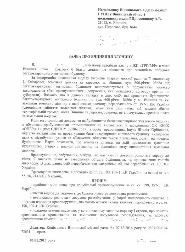 Будівельна афера ЖК «Тріумф» у Вінниці набирає обертів. Забудовник повністю ігнорує заборону будівництва багатоквартирного будинку на об’єкті. Вінничани, яким вдалося отримати офіційні відповіді від місцевої влади подають заяви про вчинення злочину з боку представників ЖК.
