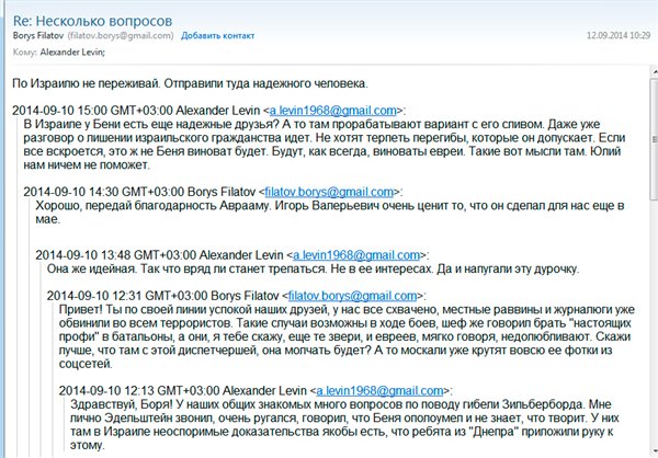 Кстати, о том, что батальоны Коломойского, под завязку укомплектованные идейными нацистами и уголовниками-отморозками, не празднуют их общих единоверцев, Аарон Левин буквально накануне долгопольской истории уже писал Борису Филатову: «Здравствуй, Боря! У наших общих знакомых много вопросов по поводу гибели Зильберборда. Мне лично Эдельштейн звонил, очень ругался, говорил, что Беня ополоумел и не знает, что творит. У них там в Израиле неоспоримые доказательства якобы есть, что ребята из «Днепра» приложили руку к этому».