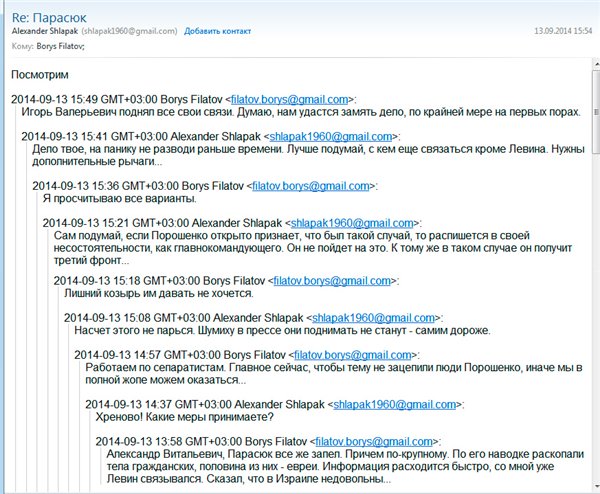 «Хреново! Какие меры принимаете?», - озаботился Шлапак. «Работаем по сепаратистам. Главное сейчас, чтобы тему не зацепили люди Порошенко, иначе мы в полной жопе можем оказаться...», - прогнозирует Филатов.