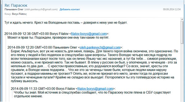 Впрочем, отсутствие конкретики не напрягло нескромного по жизни зама Коломойского, который уже на следующий день начинает гнуть пухлые пальцы перед «свободовцем» Панькевичем, хвастаясь собственными «концами» в ведомстве Наливайченко: «Чтобы ты знал. Мой источник в спецслужбах сообщает, что по Парасюку после плена в СБУ существует отдельное мнение».