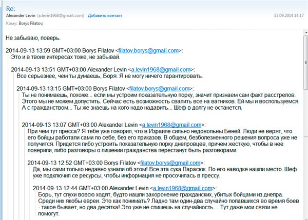 «Привет! Ты по своей линии успокой наших друзей, у нас все схвачено, местные раввины и журналюги уже обвинили во всем террористов. Такие случаи возможны в ходе боев, шеф же говорил брать «настоящих профи» в батальоны, а они, я тебе скажу, еще те звери, и евреев, мягко говоря, недолюбливают. Скажи лучше, что там с этой диспетчершей, она молчать будет? А то москали уже крутят вовсю ее фотки из соцсетей», - пытается Филатов перевести разговор на тему «диспетчерши» (вероятной свидетельницы или соучастницы уничтожения малазийского «Боинга», к которому, по мнению многих экспертов, также приложил руку «ополоумевший Беня»).