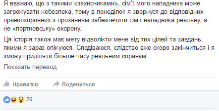 "Мне жаль эту семью, которая попала в руки циничного и беспринципного гендляра... Я считаю, что с такими «"защитниками", семьи моего нападающего может угрожать опасность, поэтому в понедельник я обращусь в соответствующие правоохранительные с просьбой обеспечить семье нападающего реальную, а не "портновскую" охрану", - пообещал Пашинский.