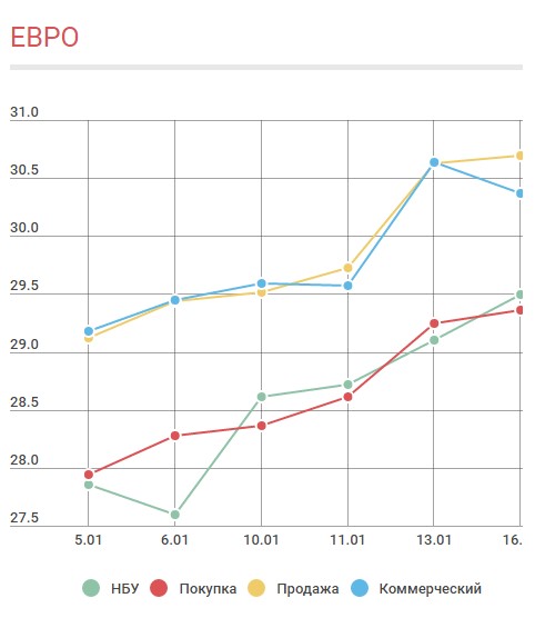 Национальный банк Украины (НБУ) на 16 января 2016 года понизил курс гривни по отношению к американскому доллару на 41 копейку, к евро - на 39 копеек, а к российскому рублю - на 8 копеек, обновив таким образом рекордные показатели 13 января.