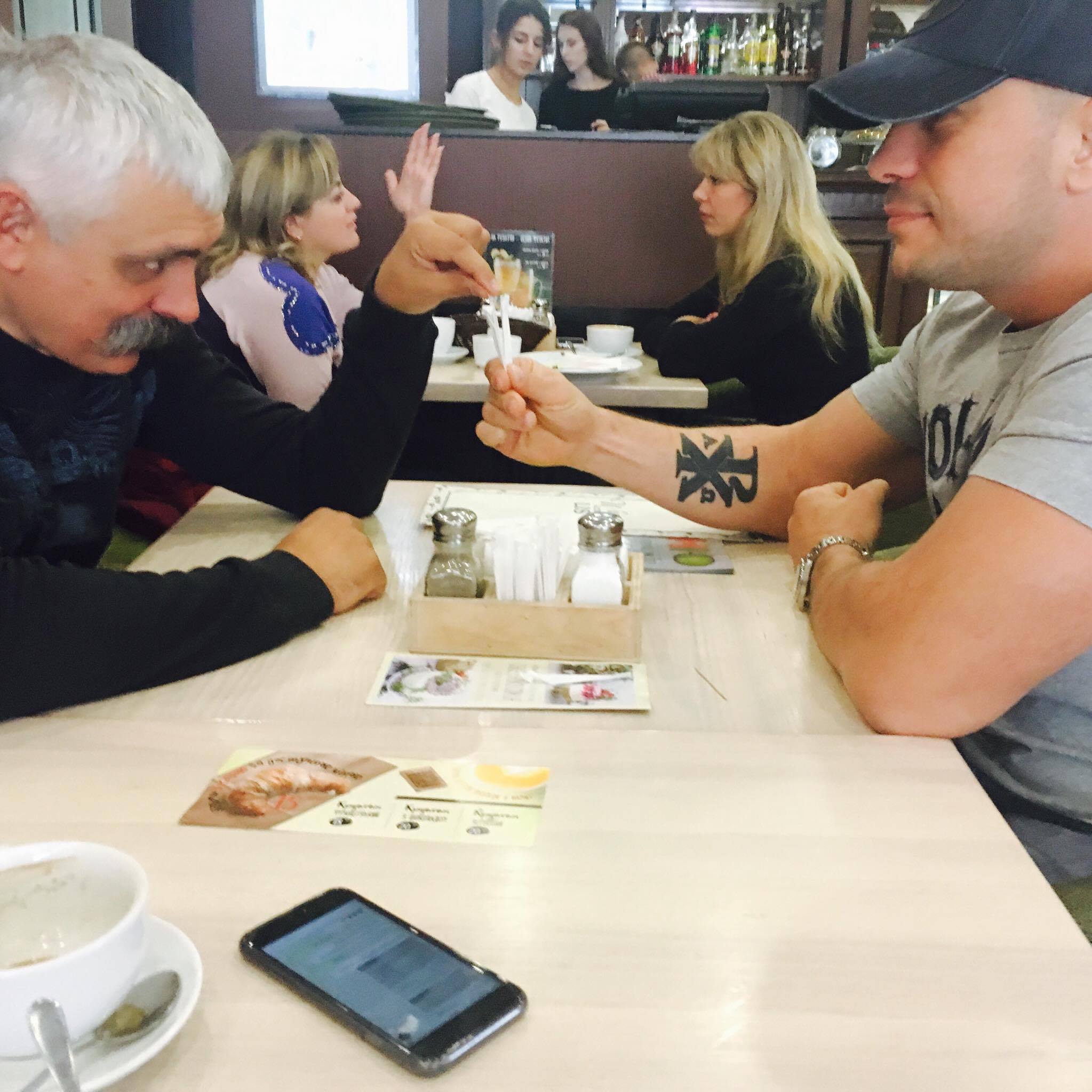 Дмитрий Корчинский тянул пакетики с сахаром из широкой ладони Ильи Кивы. На вопрос "Страны", что это все значит, Кива и Корчинский пояснили, что тянут жребий - куда идти в следующий раз. То ли в шутку, то ли всерьез.