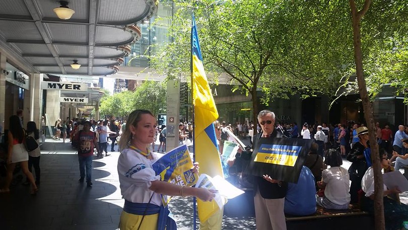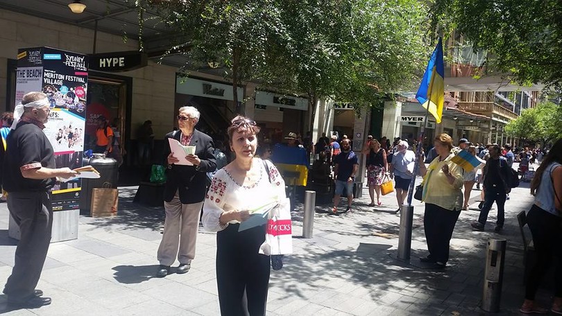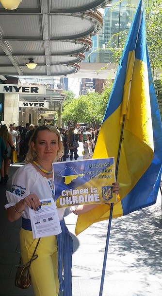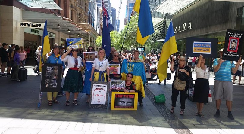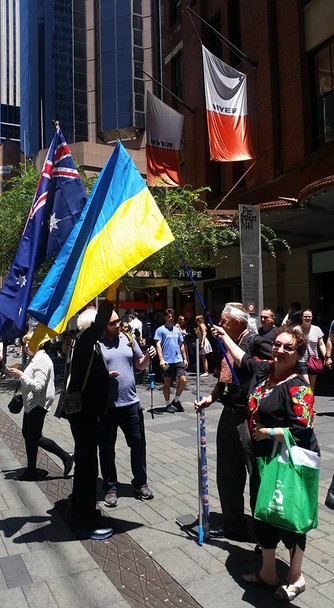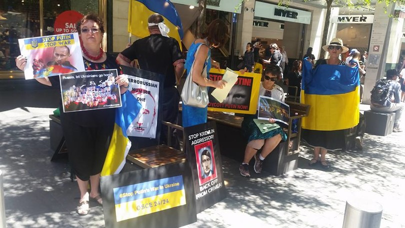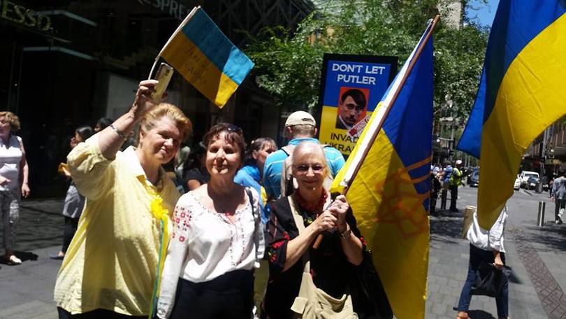 Жители города, которые работают в Автралии и граждане материка, которые имеют украинские корни, идя центром города, несли плакаты направлены против агрессии президента России Владимира Путина по отношению к Украине.