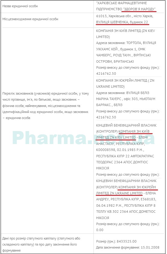 Формальными владельцами ООО "ХФП "Здоровье народу" являются два оффшора, из Британских Виргинских Островов и Белиза. Бенефициарами предприятия значатся еще два оффшора, на этот раз с Кипра.