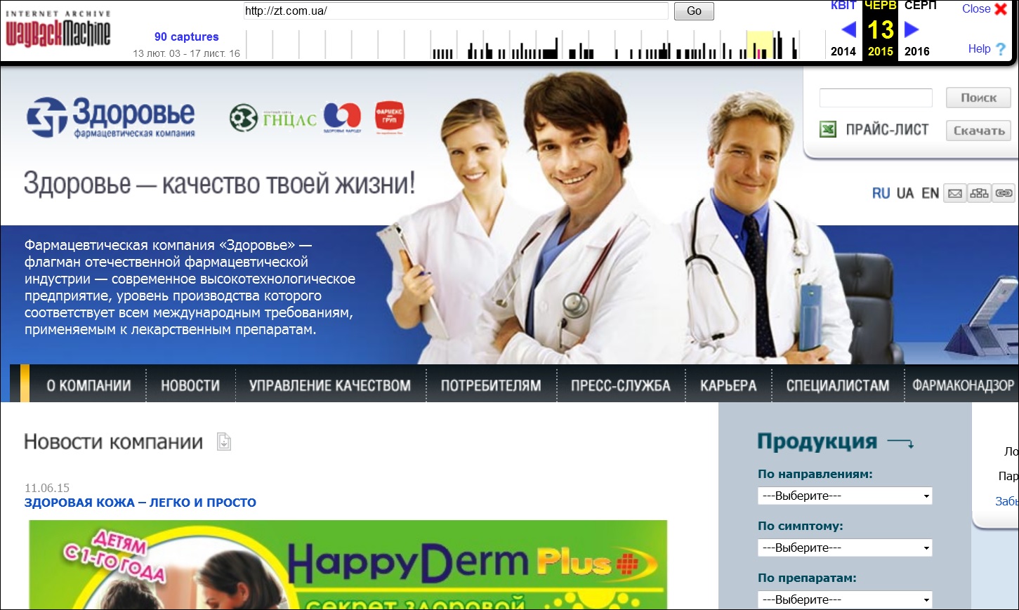 До средины 2015 года эта информация была публичной: сайт компании "Здоровье" содержал на главной странице логотипы всех указанных предприятий, также общим был прайс-лист на производимую продукцию. Более того, предприятия "Здоровье" и "Здоровье народу" до сих пор имеют общий адрес (Харьков, ул. Шевченко, 22). К примеру, такой помнит главную страницу сайта компании "Здоровье" от 13 июня 2015 года открытый сервис archive.org: указаны логотипы всех четырех компаний группы.