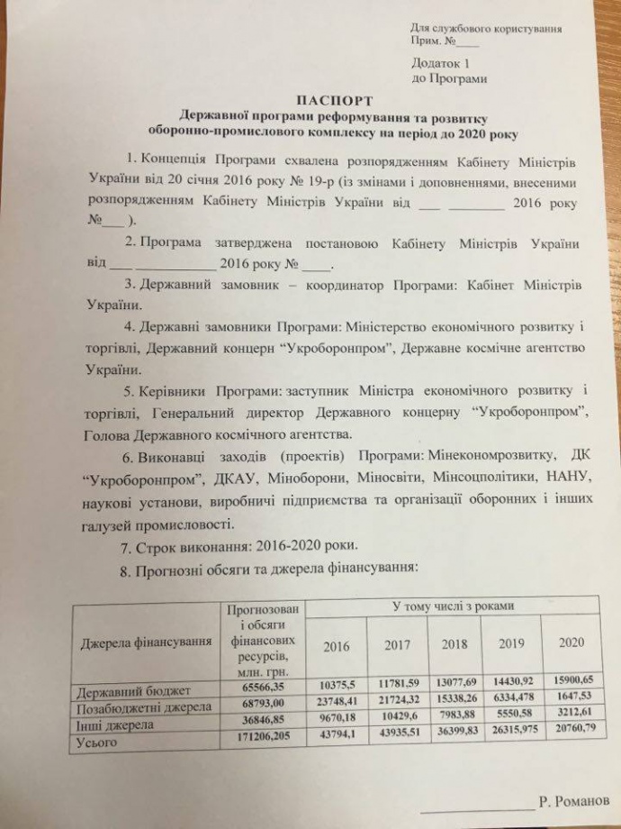 27 января 2016 года СНБО поручил правительству завершить разработку и утвердить до 29 февраля 2016 года «Государственную программу реформирования и развития ОПК на период до 2020 года».