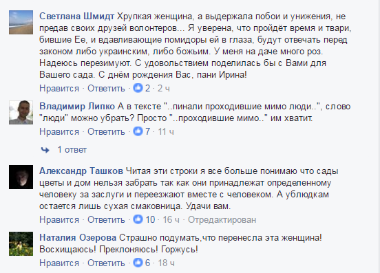 Авторы поста напомнили читателям о том, какие муки и унижения пришлось пережить Ирине, когда террористы схватили ее за то, что помогала украинской армии. К ней в дом в Ясиноватой Донецкой области вломились вооруженные мужчины, стали допрашивать, требуя назвать других людей, помогавших ВСУ. Ирину увезли в Донецк, держали и допрашивали в бывшей воинской части, а затем выставили на поругание.