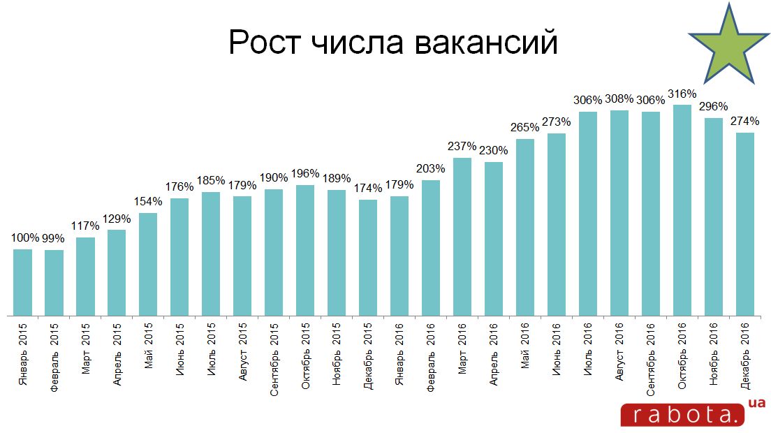 "Во времена Майдана и первого года АТО люди занимались политикой – им было не до смены работы или там вкладывания денег в развитие бизнеса, все замерли в ожидании. Поэтому мы проанализировали рост числа вакансий в процентном соотношении и январь 2015 г. взяли за 100% как точку выхода из так называемого кризиса после событий 2013-14 гг. То есть 100% в таблице за январь 2015 г. означает старт, точку спокойствия, которая то накалялась, то слегка скатывалась", - рассказывает она.
