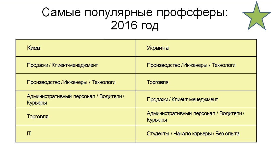 Пашкина рассказывает, что практически с 2011 г. неизменными востребованными лидерами на рынке труда являются пять сфер: продажи, административный персонал, студенты, торговля и представители IT-сферы. Так, были составлены рейтинги за последний год, где мы видим ситуацию в Киеве и Украине в целом. Столица - непроизводственный город, потому и такая разница. Выходит, что в Киеве на первом месте востребованы представители продаж и менеджеры, а в Украине в целом – производство, а после – торговля.