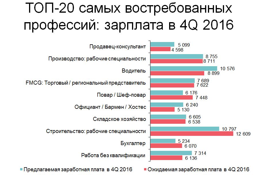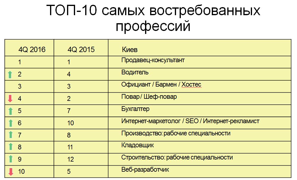 Эксперт отмечает, что и в 2017 г. эти профессии также останутся наиболее популярными среди соискателей, да и работодателей в том числе. Рабочие специальности в Украине наиболее востребованы, многие даже с высшим образованием предпочитают иметь зарплату повыше в производстве, нежели учителя в школах или врача в государственных поликлиниках. Некоторые студенты вузов идут подрабатывать продавцами или официантами в надежде пойти по карьерной лестнице вверх и стать администратором или топ-менеджером.