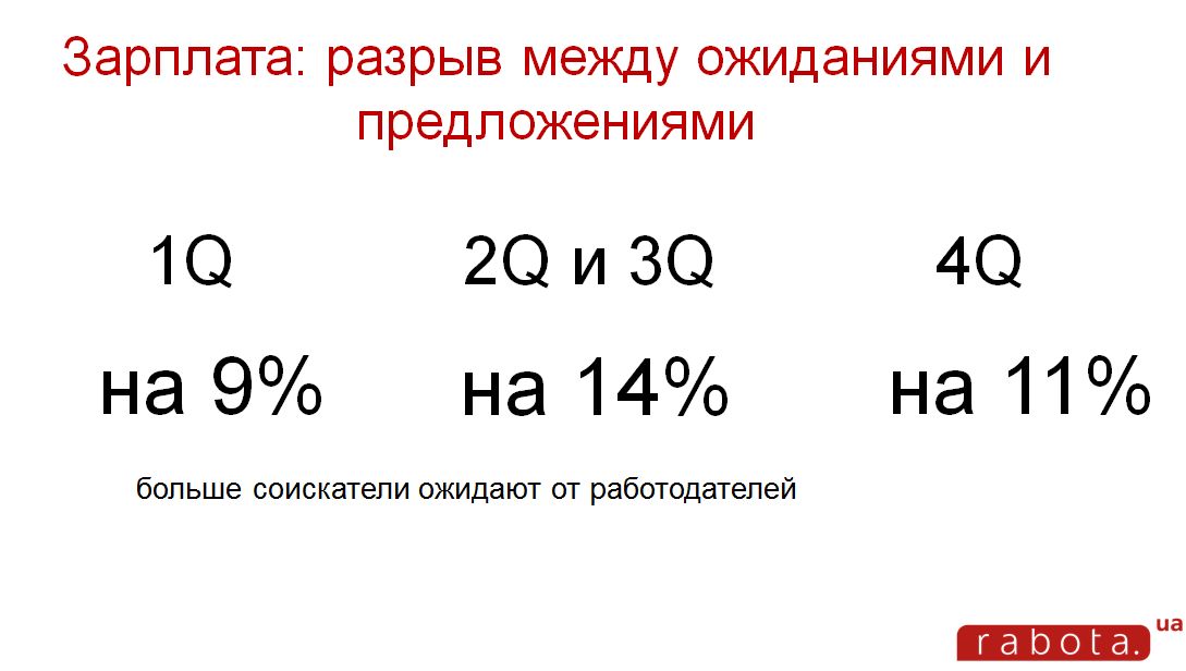 То есть узкопрофильные специалисты и люди с высшим образованием будут искать себе работу дольше, нежели все остальные. Такова статистика частного работодателя, который более конкурентоспособен на рынке труда, чем госструктуры, так как у него зарплаты повыше, что является решающим фактором при выборе вакансии современного соискателя. Хотя те, кто только окончил вуз, имеют больший спрос – такие люди считаются более обучаемыми. Так как цены на услуги и товары в Украине поднялись из-за скачков курса доллара, бюджетные структуры отстают с зарплатами от роста цен даже больше, чем частные. Аппетиты населения Украины по зарплатам в прошлом году росли из квартала в квартал.