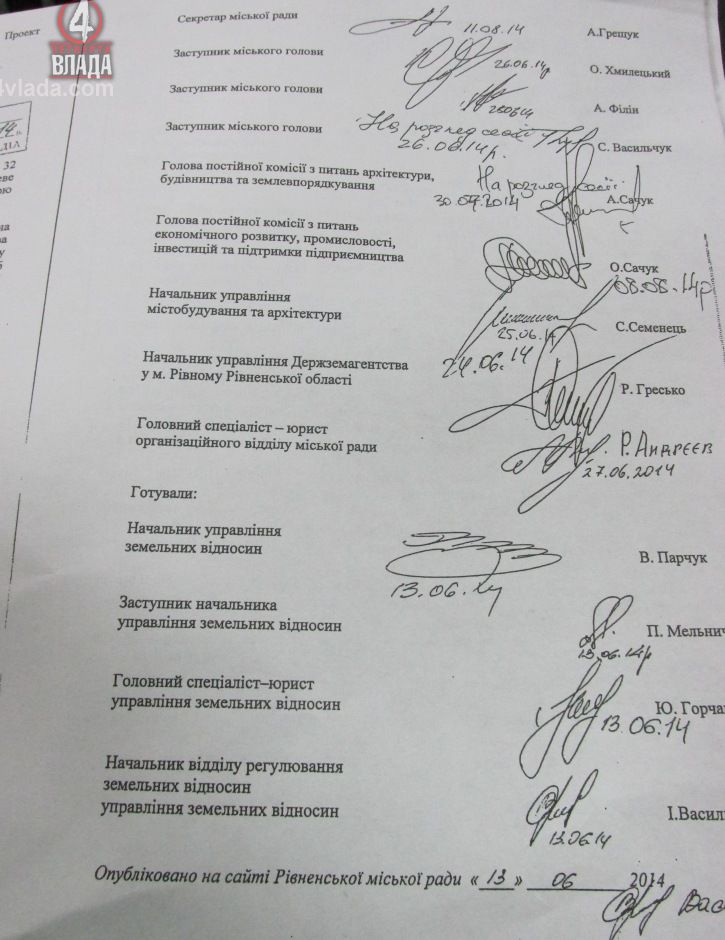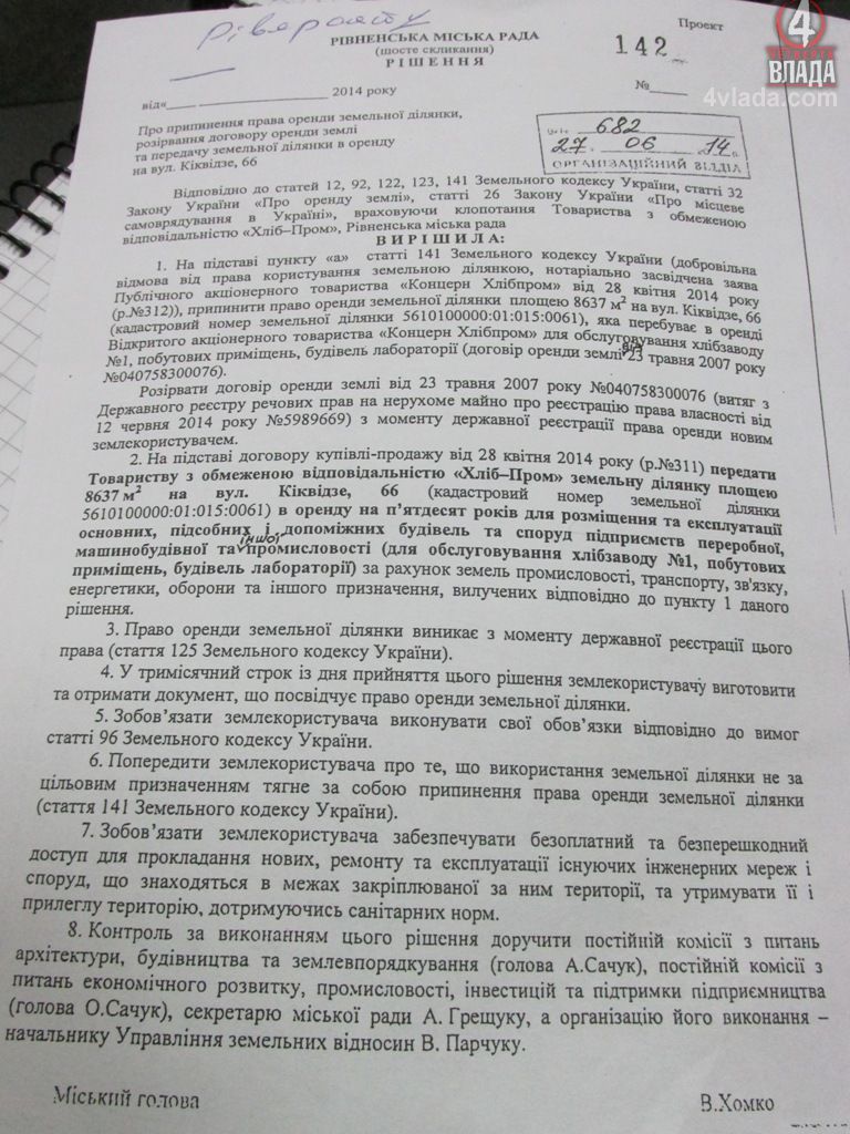 Згідно з проектом рішення, пропонувалося розірвати договір оренди з ВАТ «Концерн Хлібпром»і передати ділянку на 50 років в оренду ТзОВ «Концерн Хліб-пром». Як відомо, на зазначеній земельній ділянці зводиться житловий комплекс «Ріверсайд», що спричинило черговий будівельний скандал у місті.