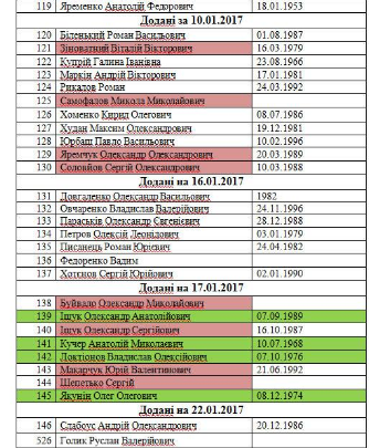 Он пояснила, что желтым цветом выделены фамилии, которые совпадают со списками на выдачу со стороны России, а фиолетовым - люди, отказавшиеся от обмена. В целом в списках значится 531 фамилия.