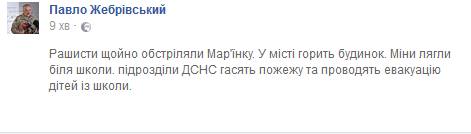 "Рашисти щойно обстріляли Мар’їнку. У місті горить будинок. Міни лягли біля школи. підрозділи ДСНС гасять пожежу та проводять евакуацію дітей із школи", – підтвердив у Facebook донецький губернатор Павло Жебрівський, але згодом видалив це повідомлення, написавши, що "ніч у Авдіївці прошла відносно спокійно" й у одній зі шкіл міста вже почалося навчання.