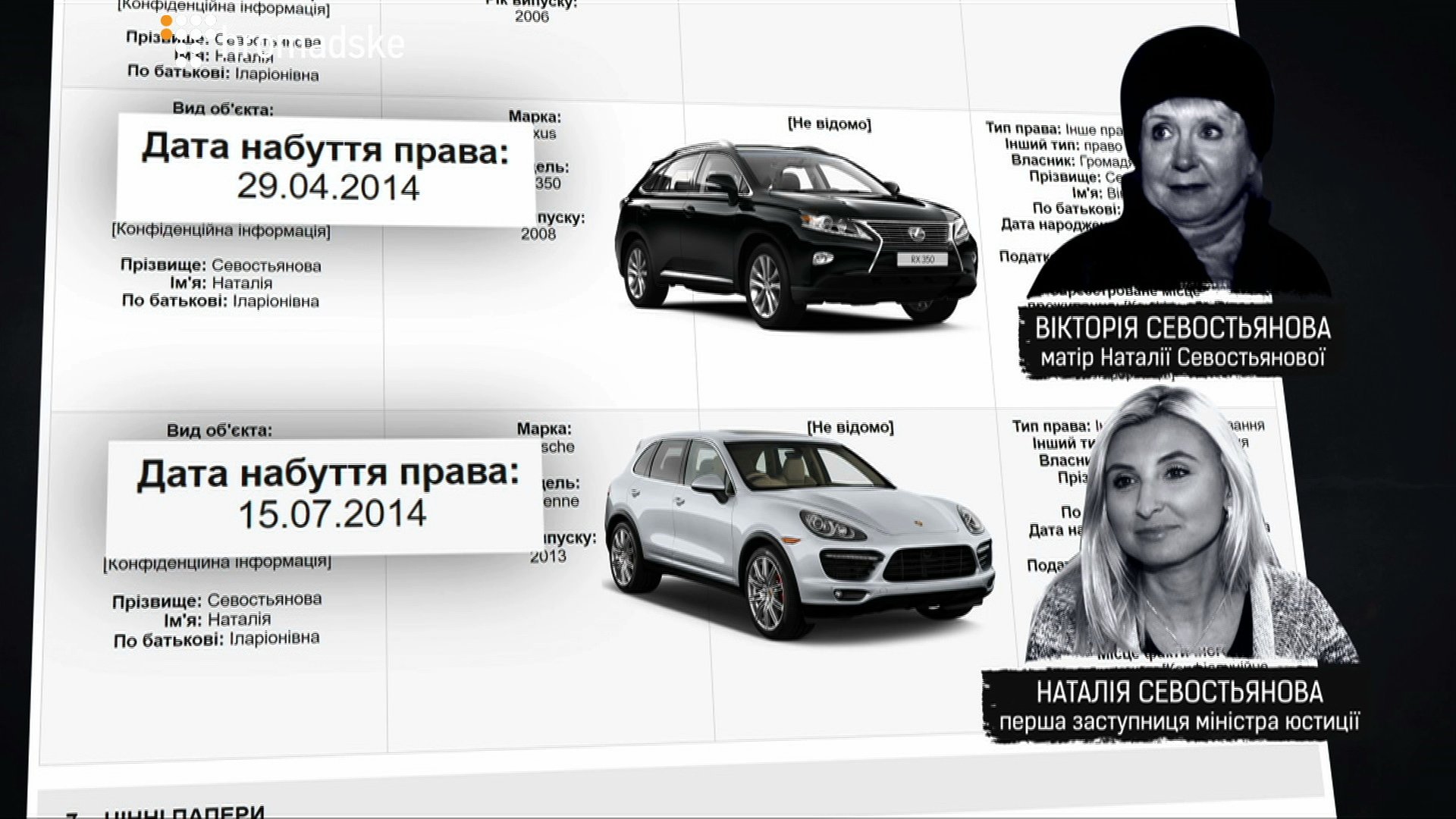 «Новопечерські Липки» – один з найдорожчих житлових комплексів столиці. Ось тут насправді нині проживає перша заступниця міністра юстиції. Крім елітного житла, в її користуванні і елітні машини. Люксові позашляховики Лексус RX350 і Порше Каєн записані на матір чиновниці – Вікторію Севостьянову. Обидві машини були придбані у 2014 році. Тоді, коли сама Севостьянова вже почала працювати у Міністерстві.