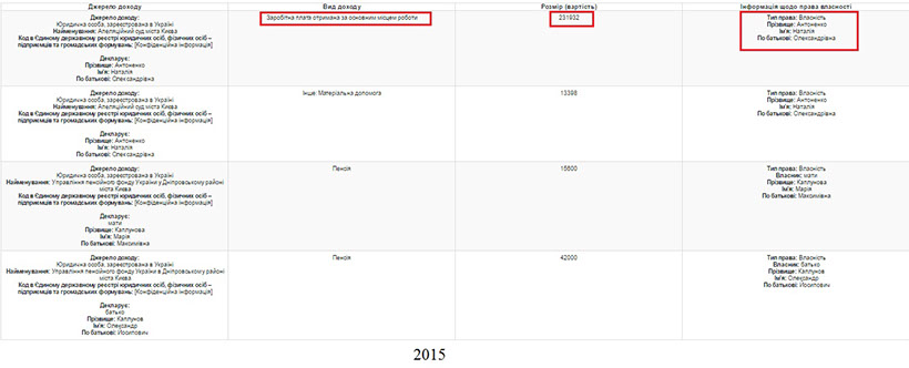 Згідно декларації за 2014 та 2015 роки основним доходом судді та її батьків-пенсіонерів є її заробітна плата.