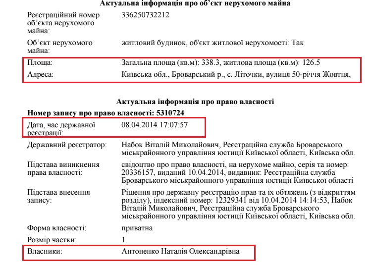 Традиційно, ситуація із майном судді вельми цікава. Так, у власності судді Наталі Антоненко - чималий будинок площею 338 м2 та дві земельні ділянки: 1496 м2 і 1388 м2 у Броварському р-ні Київської області.