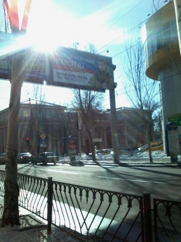 В окупованому Донецьку з’явилися рекламні плакати, які нав’язують містянам скорботу за вбитим в Макіївці (тимчасово окупована територія Донецької області) вчора, 8 лютого, бойовиком Михайлом Толстих на прізвисько «Гіві». Про це пишуть донеччани в соціальних мережах.
