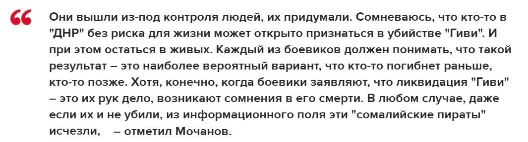 Он сообщил, что на данный момент пока нельзя с абсолютной уверенностью утверждать, что Гиви уничтожили. По мнению волонтера взрывы и зжигание не дают возможности провести точную идентификацию останков трупа. Есть варианты, при которых одиозные личности резко выводятся из информационного поля для безболезненной организации последующих выборов на Донбассе: Мочанов подчеркнул, что террористы должны отдавать себе отчет в том, что рано или поздно все они будут уничтожены, однако заявление об убийстве Гиви от рук самих террористов наводит на мысль о сомнениях в достоверности информации о его гибели: