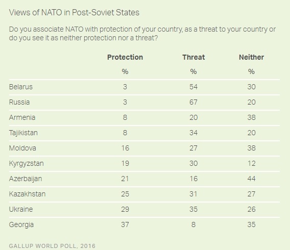 Как сообщается, в 2016 году выросла доля жителей Украины, которые более склонны рассматривать НАТО как угрозу, нежели защиту. Таких насчитывается 35%. При этом 29% украинцев считает НАТО защитой, а 26% неопредились.