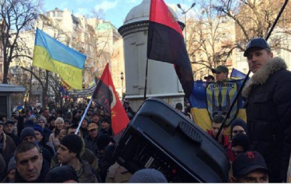 Так, после основного митинга непосредственно на Майдане, активисты, в рядах которых много представителей националистических организаций, бойцов добробатов, участников АТО, нардепы, пошли колонной к Администрации Порошенко.