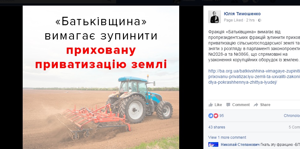 Фракція «Батьківщина» вимагає від пропрезидентських фракцій зупинити приховану приватизацію сільськогосподарської землі та зняти з розгляду в парламенті законопроекти №2028-а та №3866, що спрямовані на узаконення корупційних оборудок із землею», -- написала лідерка фракції «Батьківщина» Юлія Тимошенко на своїй сторінці у Фейсбук.