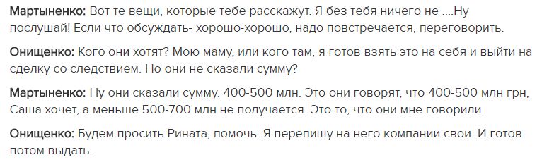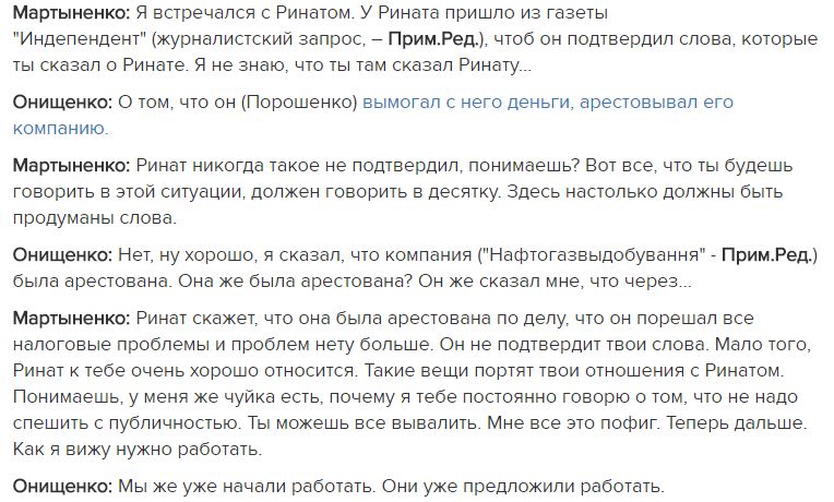 Яценюк владеет информацией о мнении Ахметова относительно Онищенко и передаёт (пересказывает) эту информацию, например через Мартыненко, который является гонцом Порошенко: